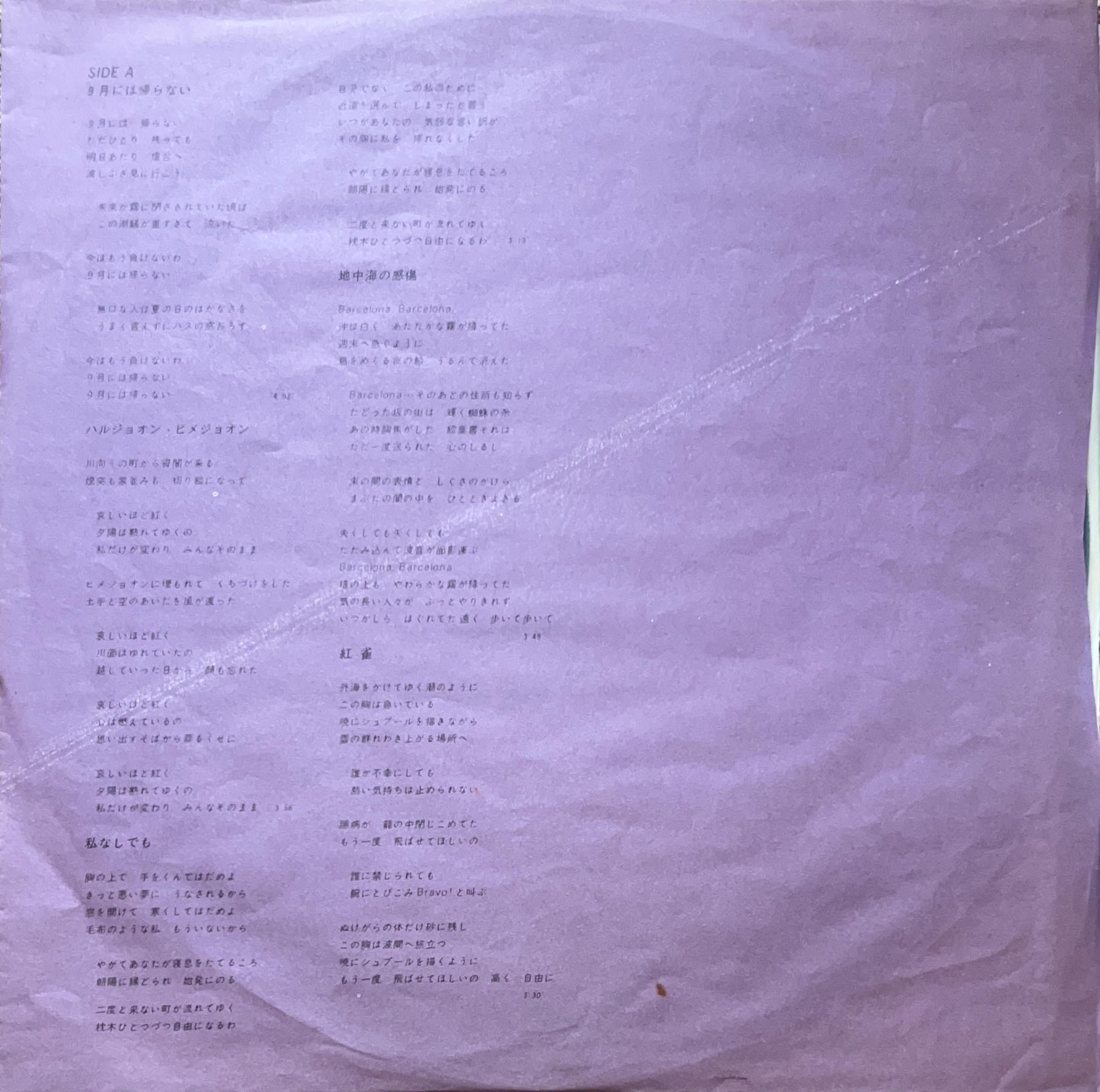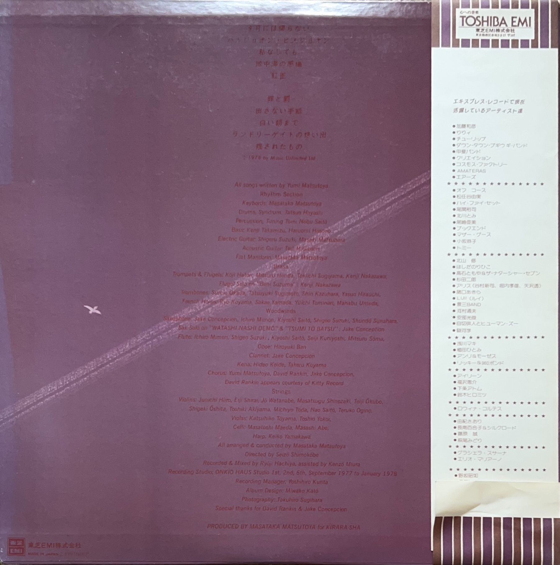 「LIGHT MELLOW 和モノ SPECIAL」掲載!! DJ XXXL氏の「NIPPON BREAKS & BEATS」に収録された事でも人気の「LAUNDRY-GATEの想い出」、和製ブラジリアン「私なしでも」、JAPANESEボッサ「地中海の感傷」など収録収録!! 荒井由実から松任谷正隆と結婚後名前を変えてからの初の5枚目のアルバム