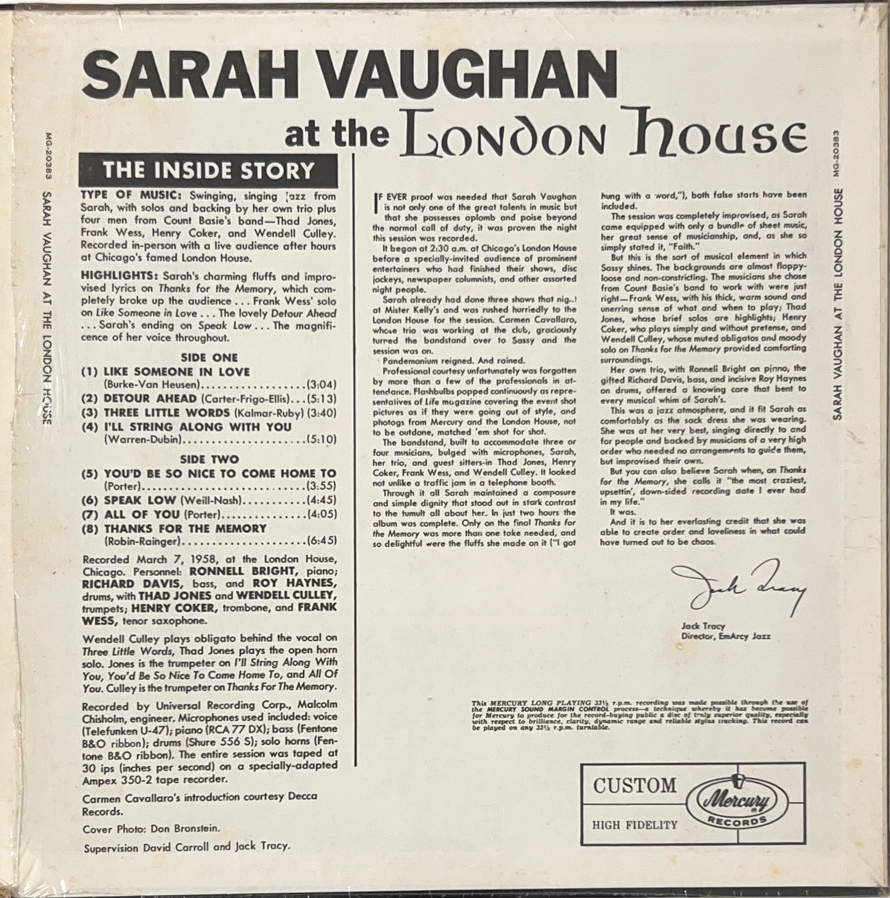 Sarah Vaughan(サラ・ヴォーン)の1958年シカゴ、ロンドンハウス(London House)ライブ音源Jazz vo.貴重盤。US Re issue/Red label 30代前半の伸びやかな声のサラ・ヴォーンのバックにはカウント・ベイシー楽団のメンバーが参加。 サド・ジョーンズ、フランク・ウェスの演奏も秀逸。