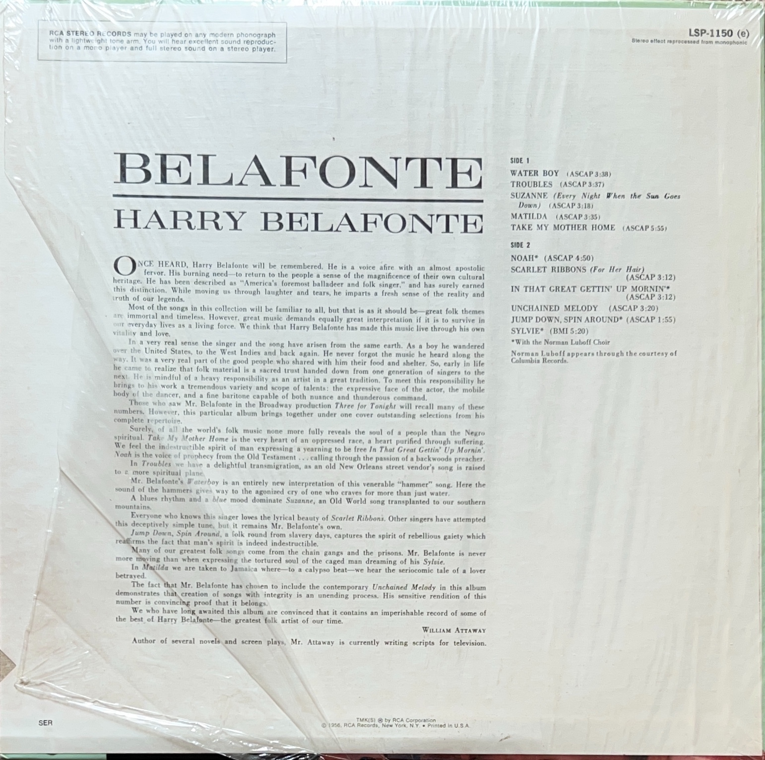 1956年リリース 米NYハーレム出身のジャマイカ系黒人歌手〜社会活動家、ハリー・ベラフォンテ。 初期名曲「Matilda」など収録 LSP 1150(e) US盤