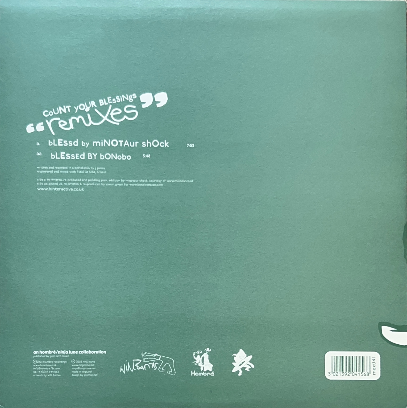 JONATHAN JAMESのプロジェクトHINTの名作リミックス12インチ。単調なビートながらメロディーに広がりを持たせるBONOBOによるリミックスも良いですが、 MINOTAUR SHOCKによるリミック スは複雑なリズム使いながら牧歌的な美しいメロディーを生み出し完全に自分色に染め上げたメロディック エレクトロニカの最高峰に仕上がっています。