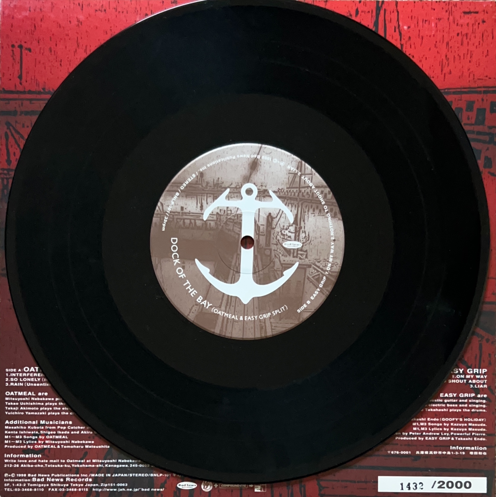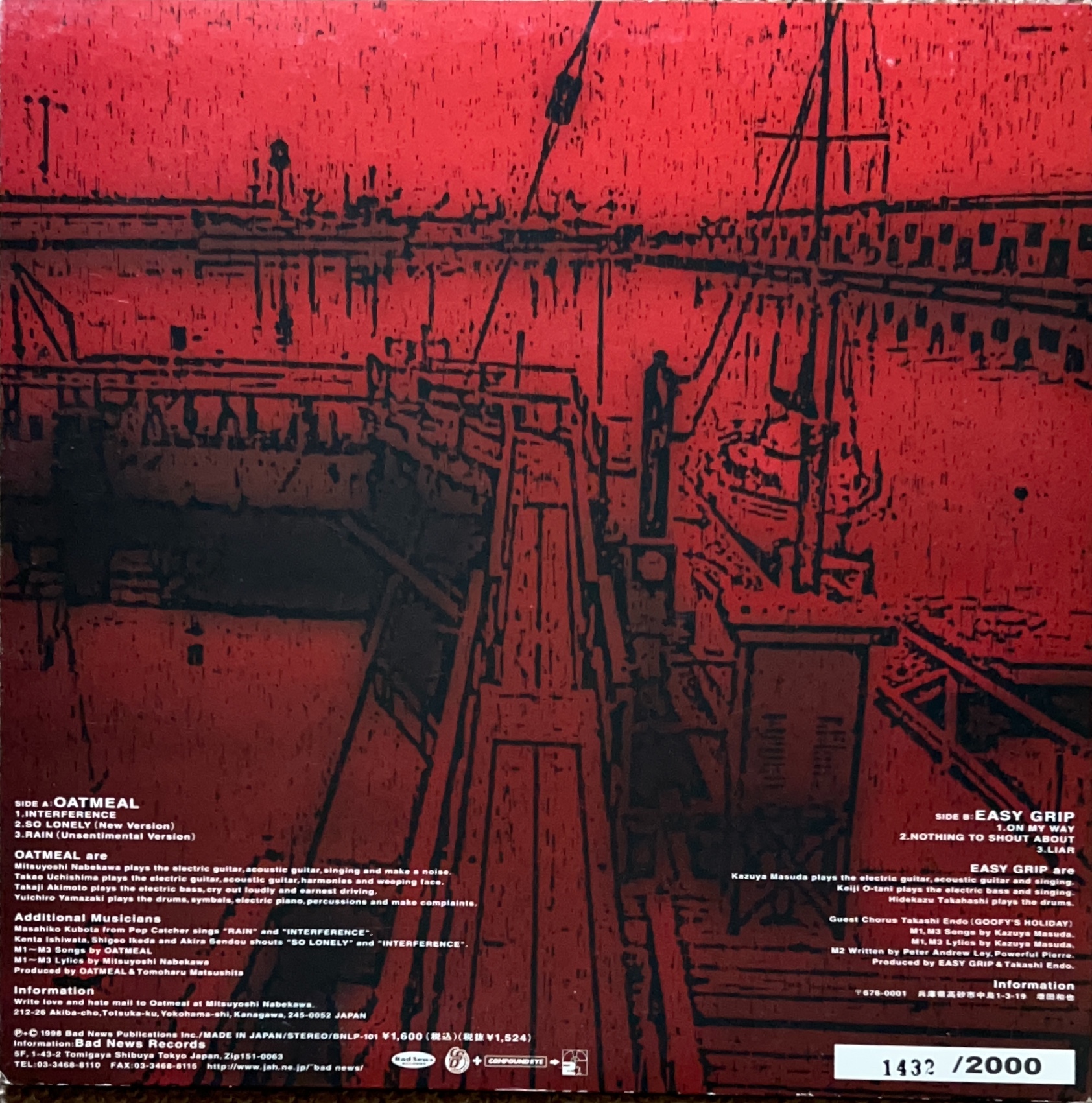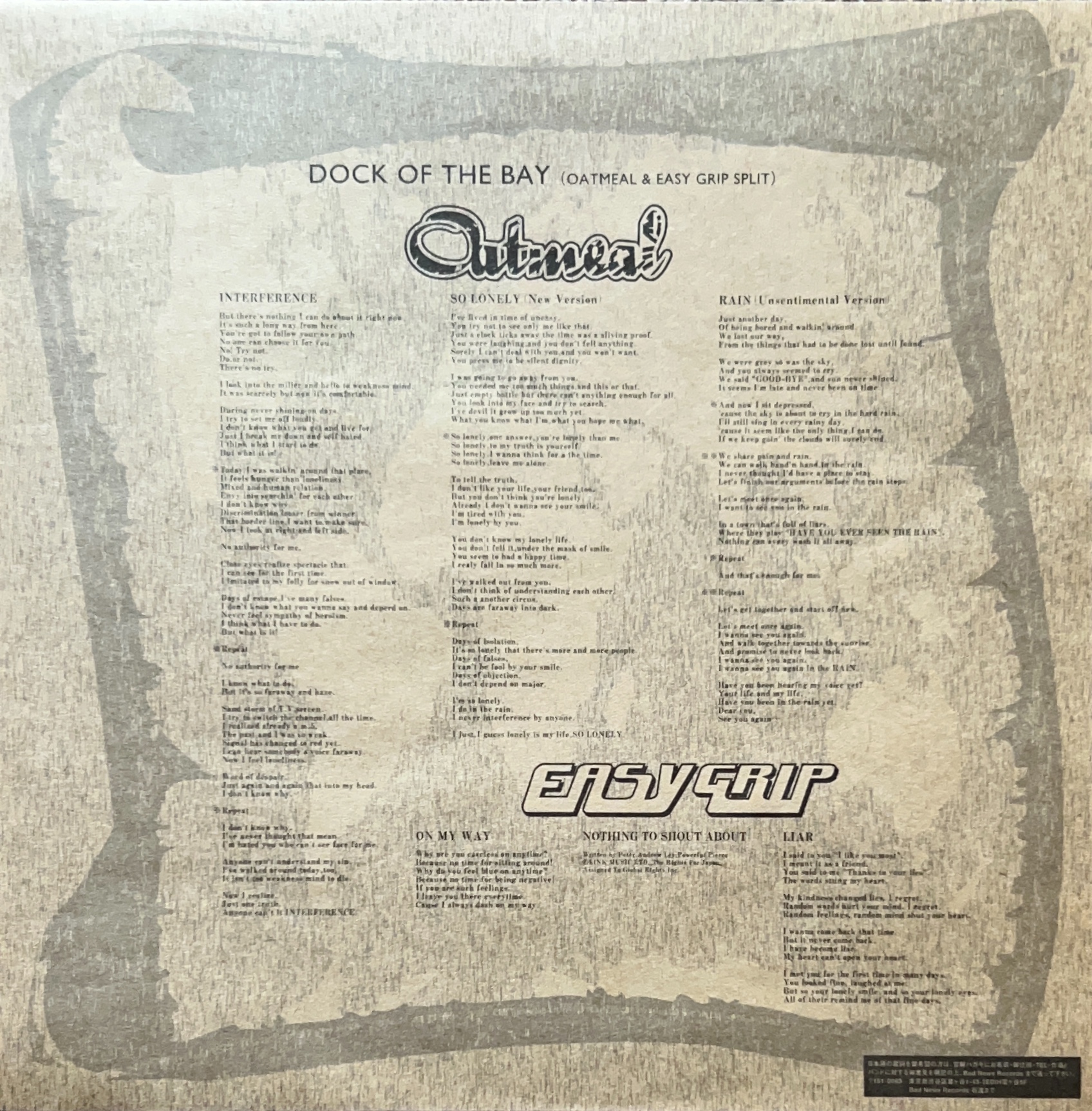 1998年リリース 2000枚限定ナンバリング入スプリット 10inch メロディックバンドOatmeal、Easy Gripによる全6曲収録 BNLP-101