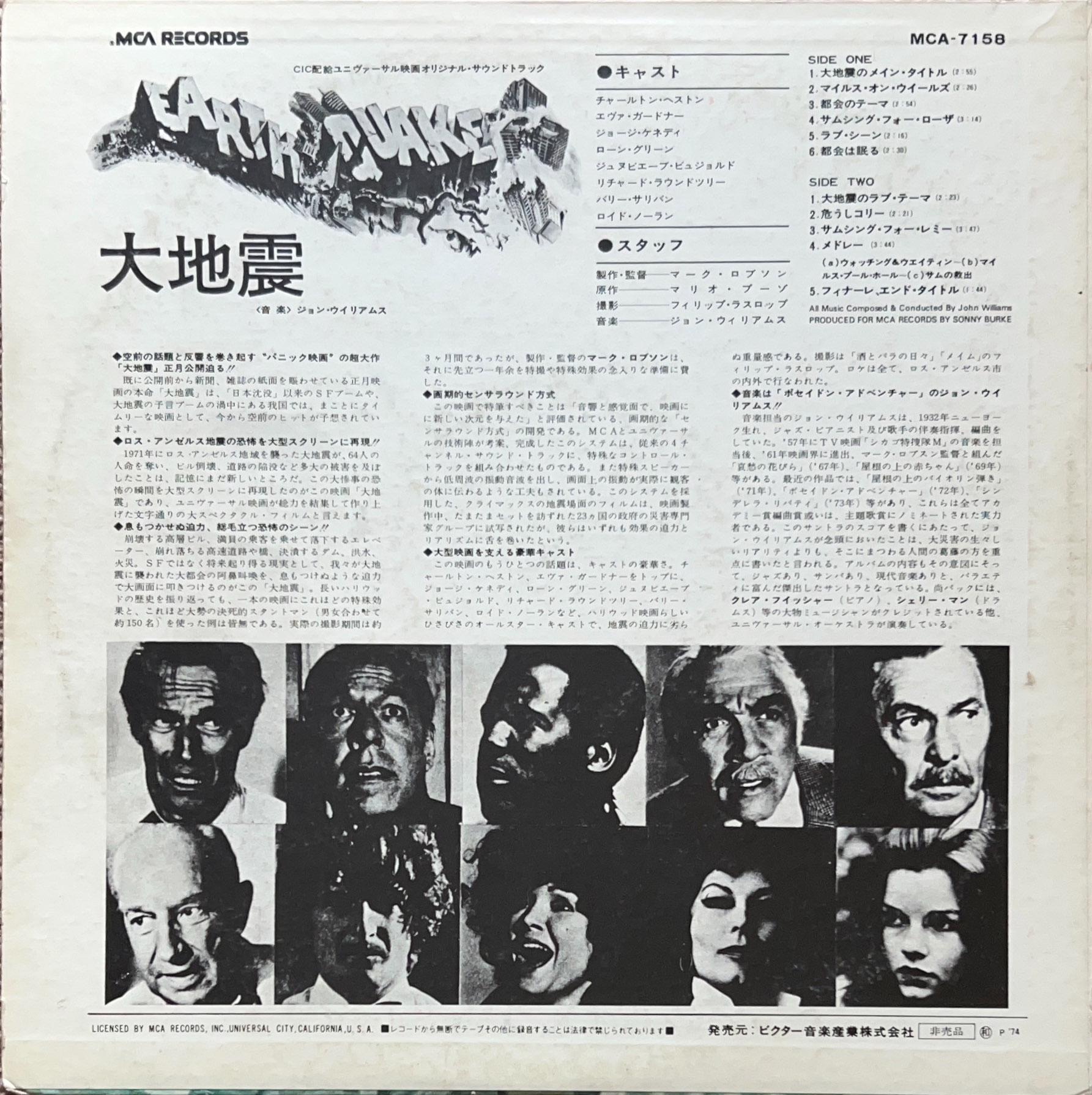 1974年のアメリカ映画「大地震」のオリジナル・サウンドトラック ロサンゼルス地震のモチーフとして制作された MCA-7158 希少見本盤