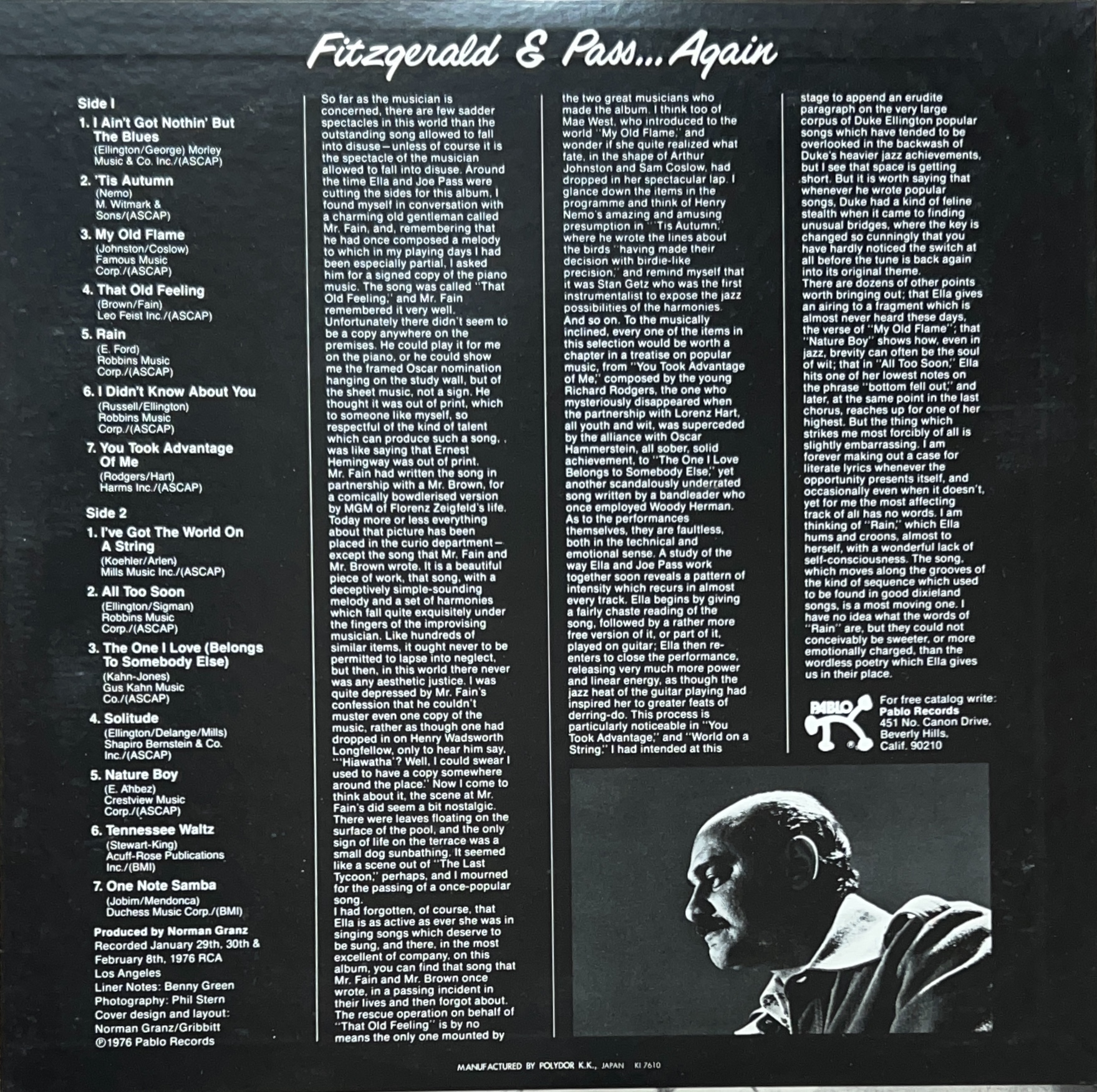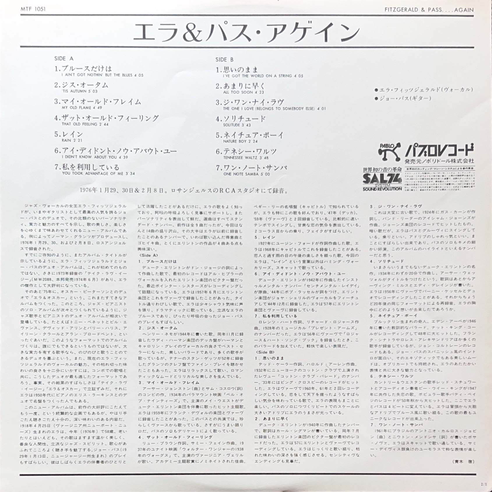 1976年リリース JOE PASS(ジョー・パス)とのコラボレイト 歌とギターだけのシンプルな構成で、エラのヴォーカルが際立つ1枚 MTF 1051