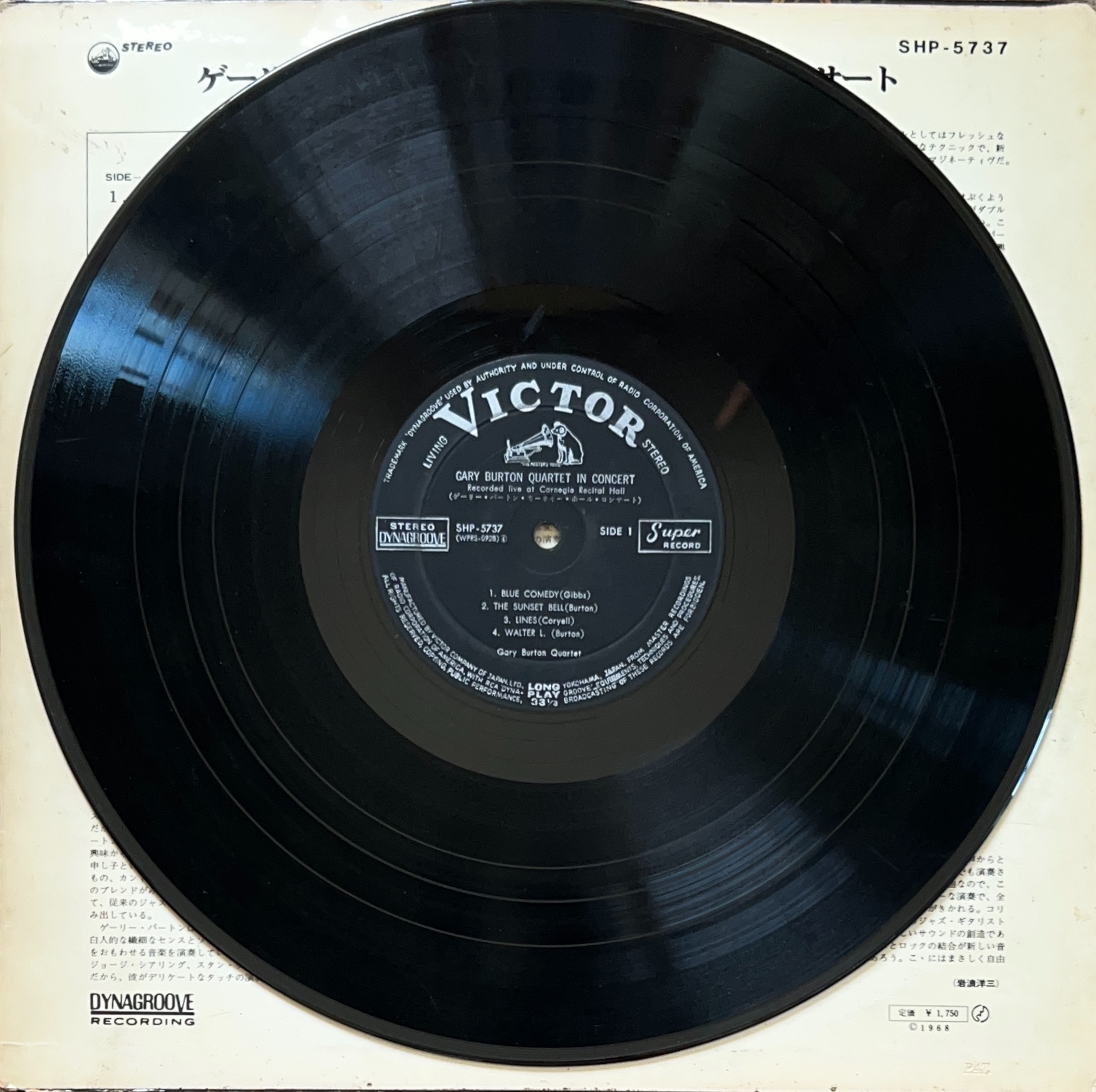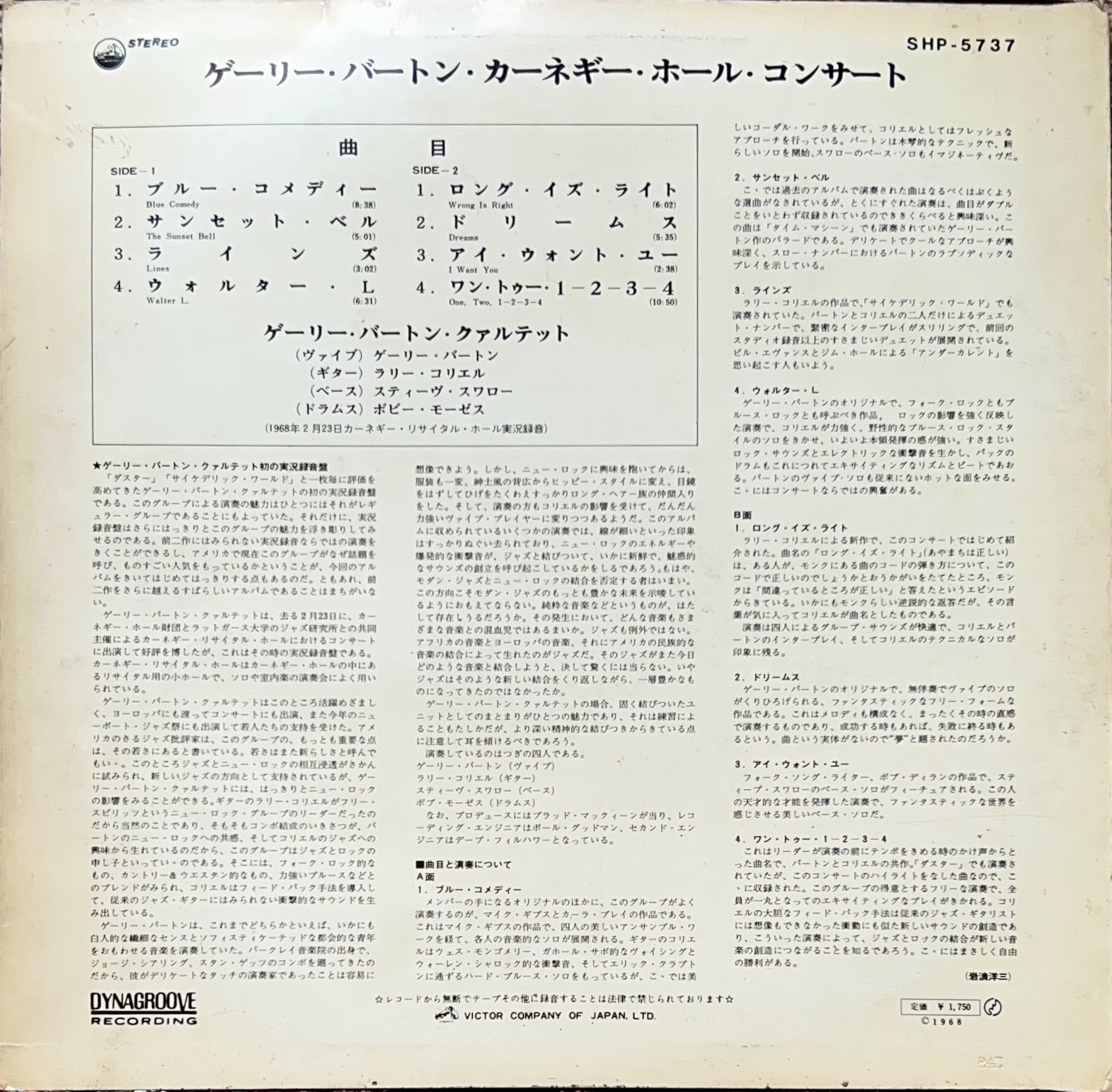 1968年リリース ビブラフォンの名手「ゲイリー・バートン」率いるカルテット、カーネギー・ホールでのライブ実況録音盤。 ジャズ・ロック名盤 SHP-5737