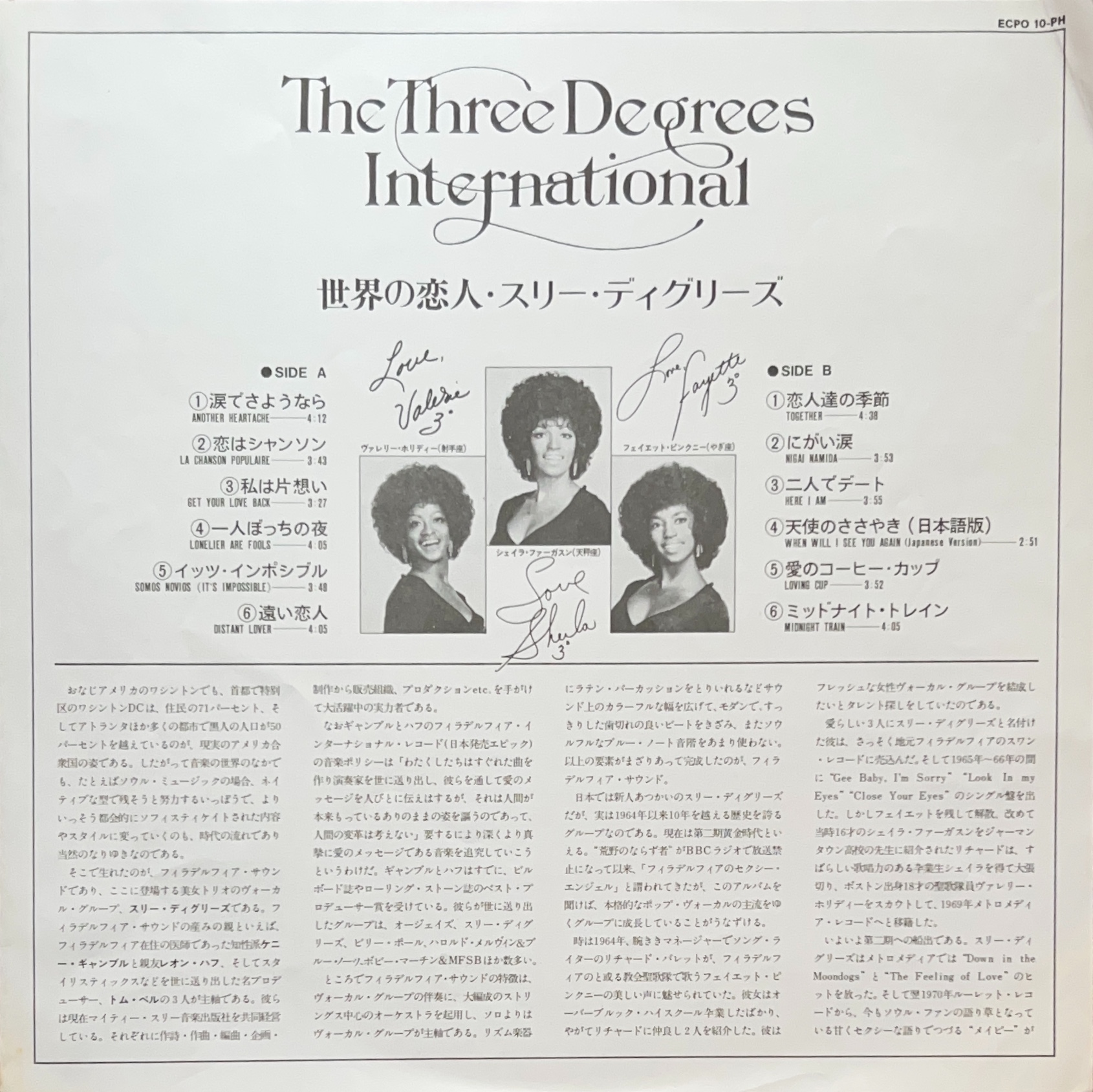 スリー・ディグリースが日本語で歌う、筒美京平作曲、深町純アレンジのスリー・ディグリーズが日本語で歌うカタコト・ソウル「にがい涙」の2曲、細野晴臣作曲、ティン・パン・アレー演奏によるディスコ名曲「Midnight Train」が日本盤で収録