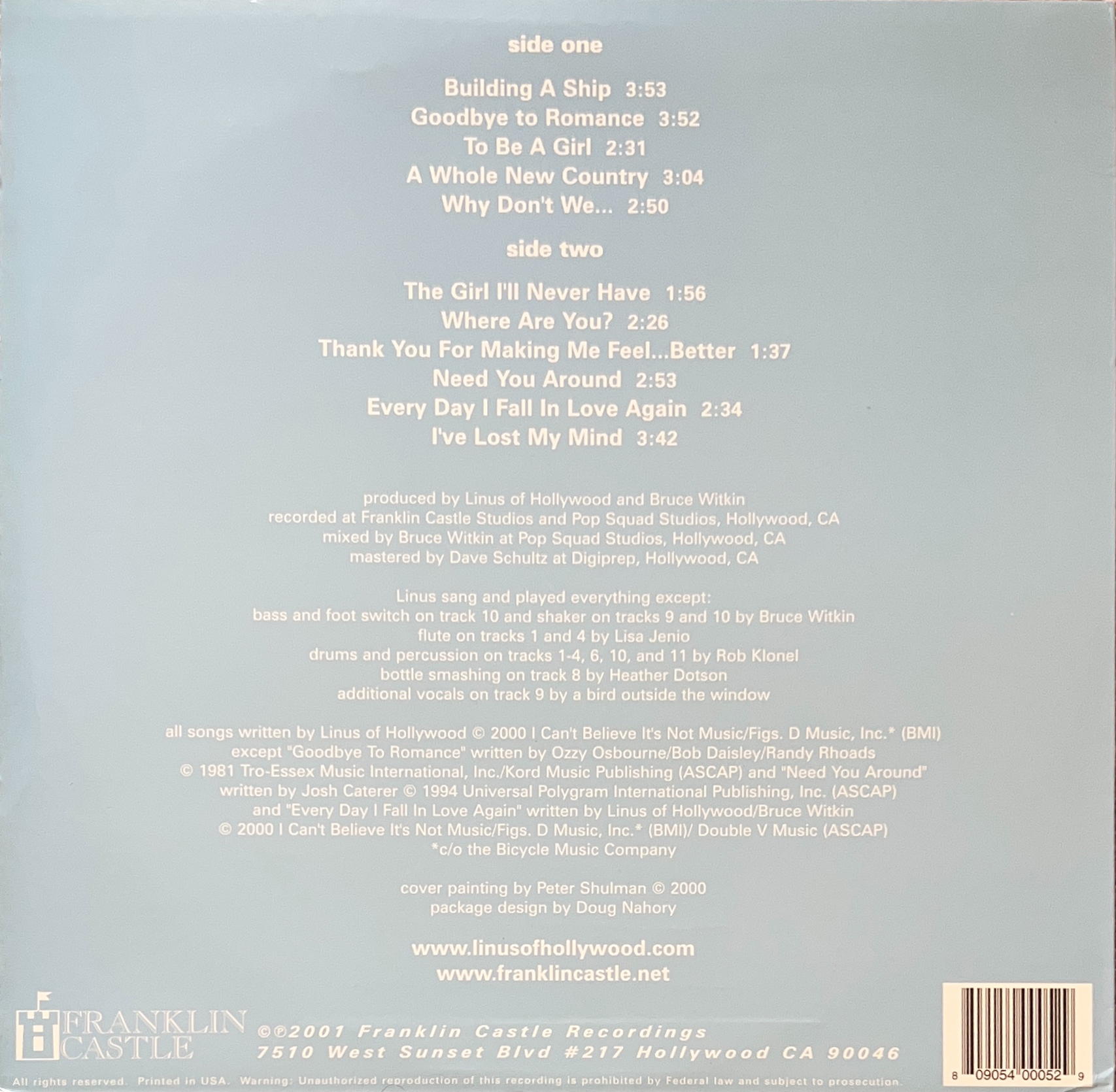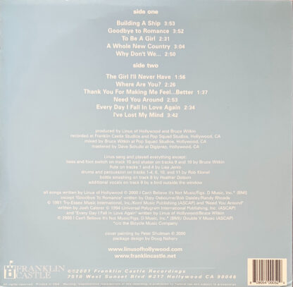 TIM BURGESSのソロアルバムのプロデュースでも名を上げたポップ職人LINUS OF HOLLYWOODのアルバム。 PREFAB SPROUTをギターポップ寄りにしたようなメランコリックなポップソングが目白押しの傑作です。BEN’S SYMPHONIC ORCHESTRAのアノ曲を思わせる軽やかなインディーボッサ名曲「AWHOLE NEW COUNTRY」がおすすめ。