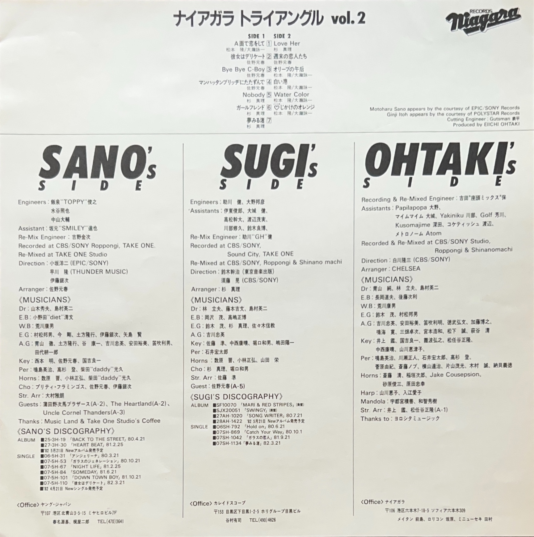 1982年大瀧詠一の主催する《ナイアガラレーベル》から発表されたアルバム『NIAGARA TRIANGLE Vol.2』佐野元春、杉真理と組んでのスペクターサウンド。BUDDY HOLLYへのオマージュ名曲「