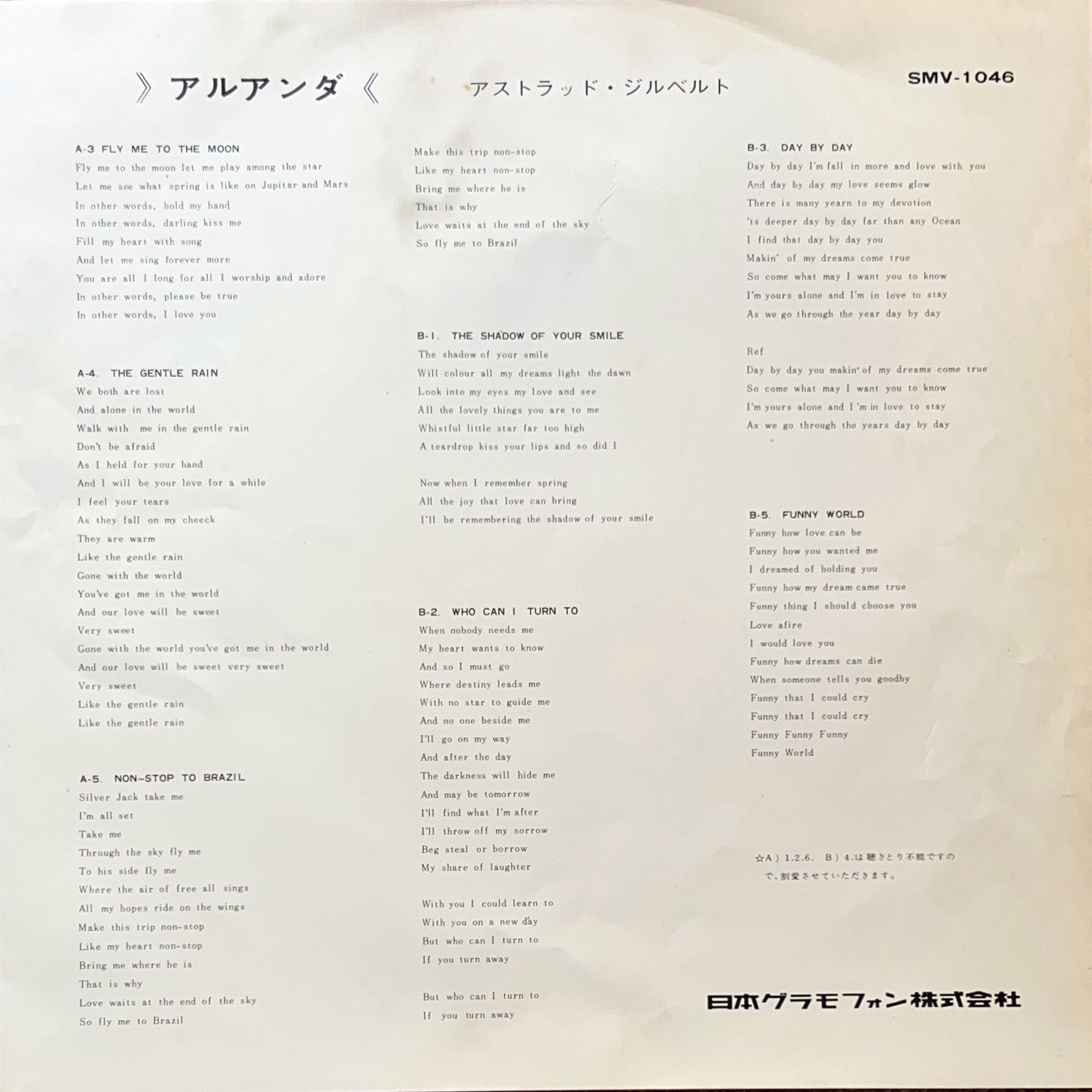 ※ジャケ、リングウェア、経年の変色、歌詞カード付き、盤面A面良好、B面1カ所薄いキズ(チリノイズ)